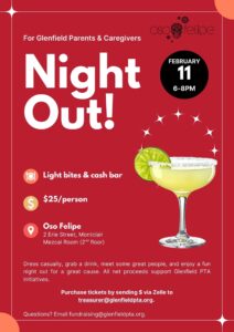 The Glenfield PTA is hosting a Parents’ Night Out fundraiser on Wednesday, February 11, from 6:00–8:00 p.m. at Oso Felipe (Mezcal Room, 2nd floor) in Montclair. Join us for light bites, a cash bar, and a chance to connect with fellow parents for a fun evening out—all while supporting important Glenfield PTA initiatives.