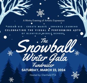 The SnowBall Gala is a fundraiser that will be a new primary way for the Glenfield PTA to make big contributions to our Visual & Performing Arts magnet, Glenfield Middle School. The goal is for this fundraiser to be the primary way for the Glenfield PTA and its community to make significant contributions to our programs which make this school so unique. These electives provide opportunities for students to engage in various music, dance, chorus and art programs to name a few and open the door for amazing creative minds to shine. Students have the opportunity to take part in or audition for programs such as musical production, a sculpture class, percussion ensemble or even a jazz band. We thank you for supporting the Glenfield PTA and the Visual and Performing Arts Magnet, Glenfield Middle School.